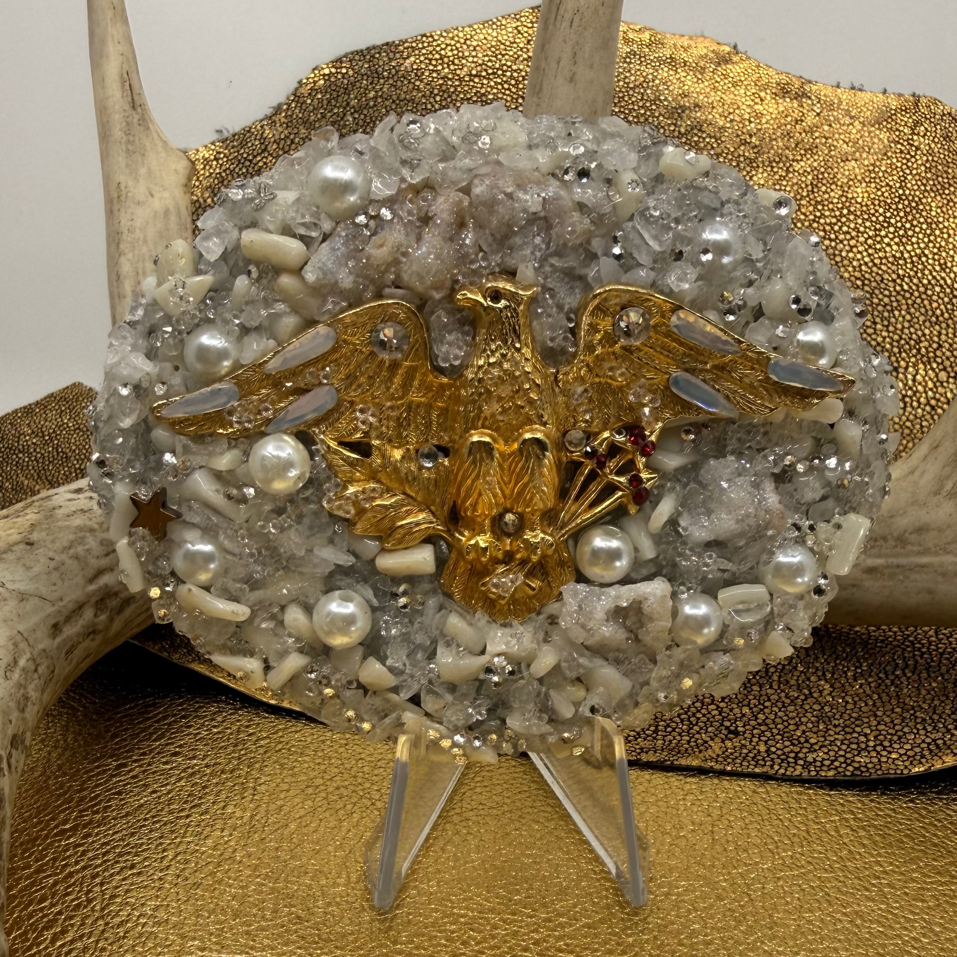 The Golden Eagle buckle has a gold eagle carrying the branch and arrows as a centerpiece. The base is comprised of white stones, minerals and pearls. The buckle is finished with opaque, red and diamond-colored crystals.