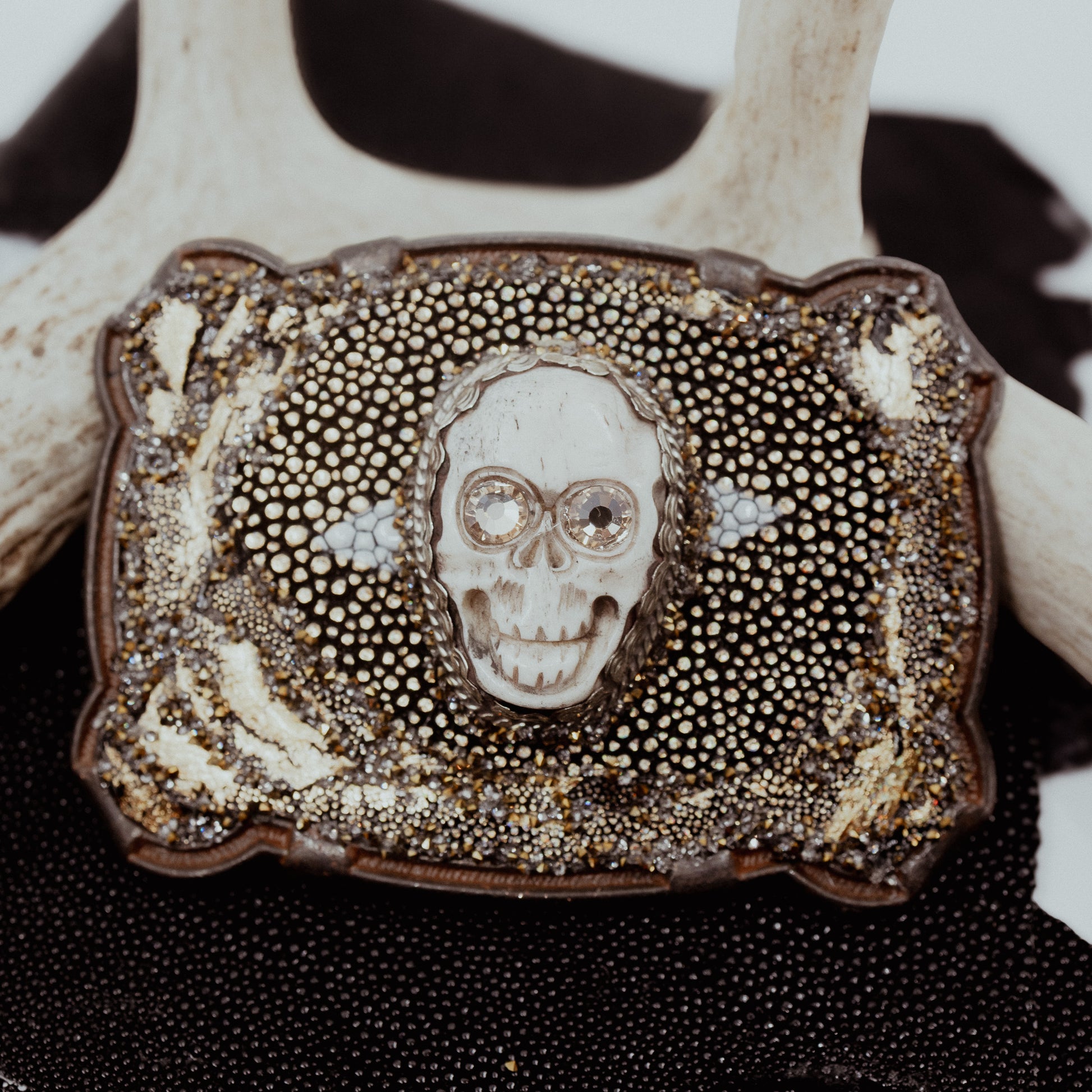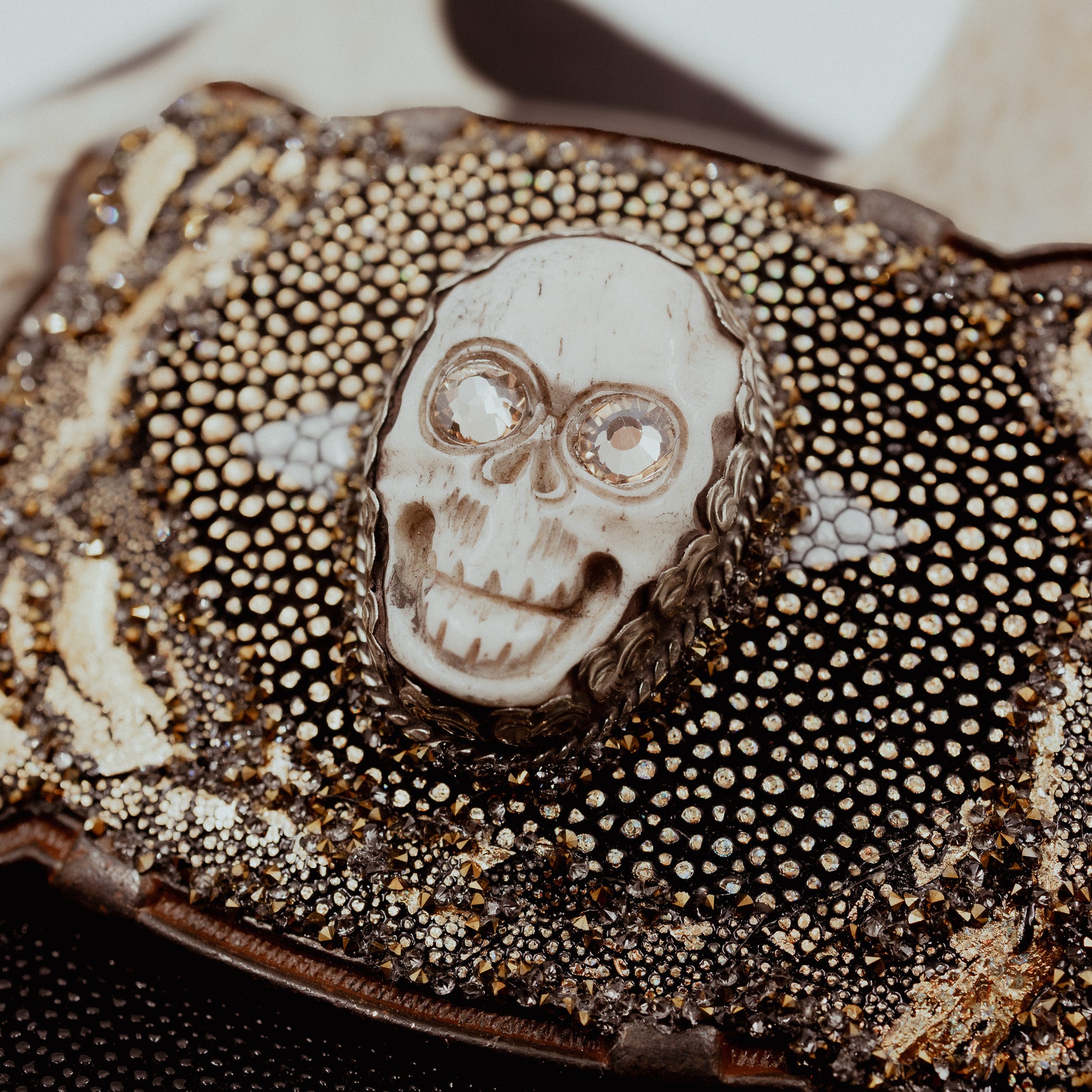 The Gold Skull buckle has a skull centerpiece with gold colored crystal eyes. The base is covered with gold stingray with the eye anchoring the skull. The buckle is finished with clear and gold-colored crystals.