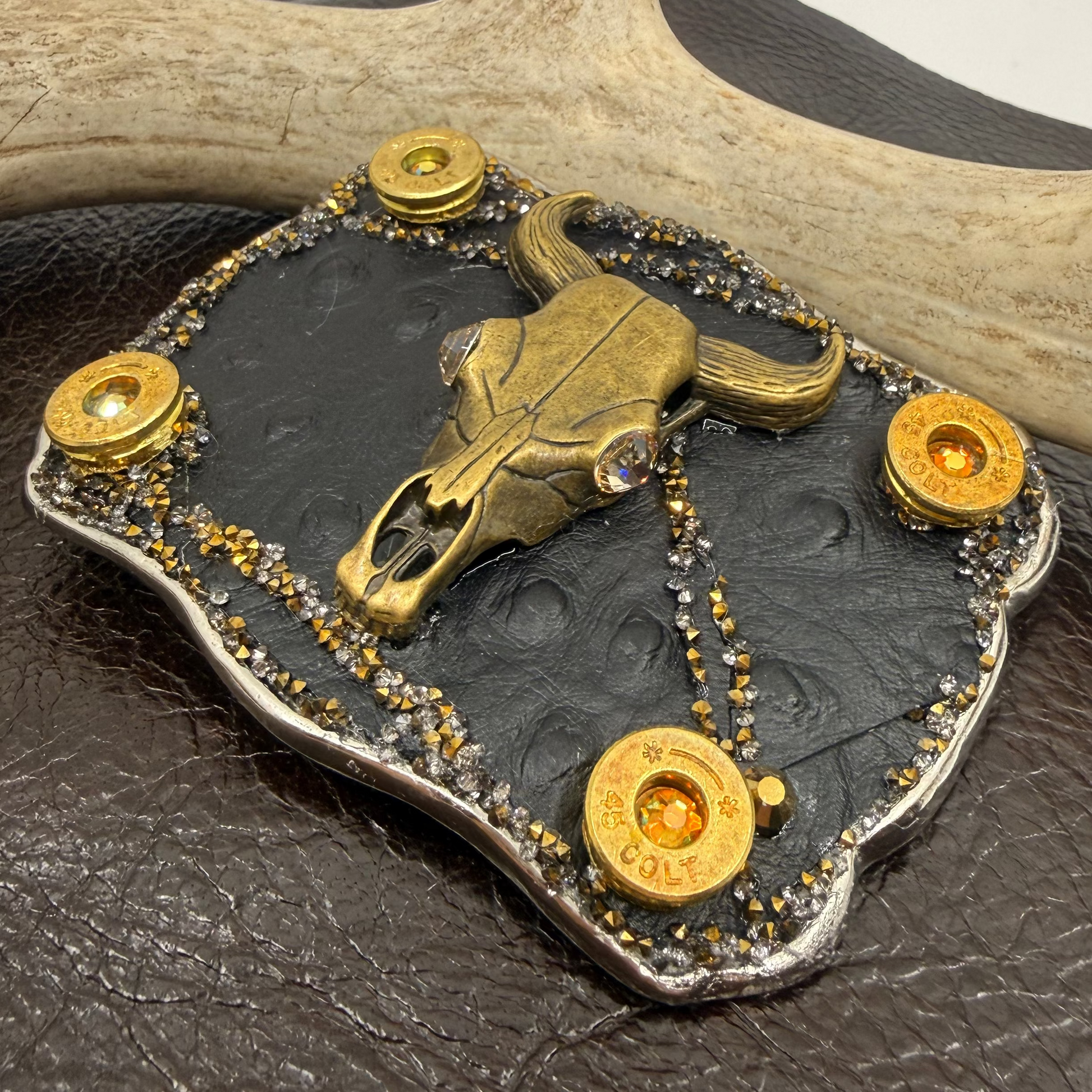 The Steer and Colts buckle has a Steer centerpiece with a base covered in Ostrich. The buckle is anchored with 45 Colt cartridge heads with crystal centers and is finished with gold and silver colored crystals.