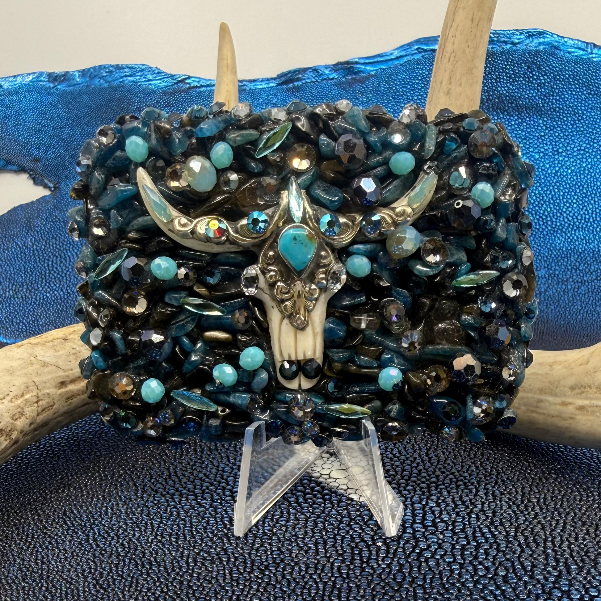 The Aqua Steer buckle has a steer centerpiece adorned with silver and turquoise. The base is covered in blue and clear stones with various shapes and sizes of blue, black and clear crystals.